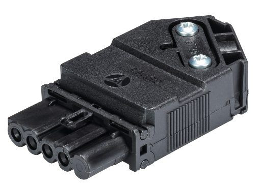gesis® MINI Steckverbinder, gewinkelt, im 5-poligen Gehäuse, Polzahl 4, Buchse, Anschlussart Schraubanschluss, Bemessungsspannung 250 V / 400 V, Bemessungsstrom 16 A, Kabeldurchmesser 6 - 11,5 mm, Codierfarbe / Kontakteinsatz schwarz