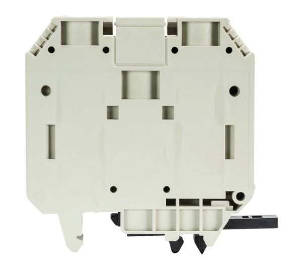 Universalfuß für Tragschiene TS 32 und TS 35, unzerbrechliche Isoliergehäuse aus PA 6.6, dauertemperaturbeständig bis 100 °C, Klemmkörper und Klemmschraube unverlierbar, mit vierstelliger Beschriftungsaufnahme auf 2 Seiten, Klemmen 35 bis 150 mm² in geschlossener Ausführung,