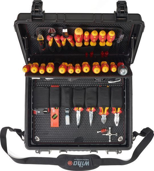 Wiha Elektriker Competence XL-Koffer 80-tlg. Inhalt: Schraubendreher: Je 1x Wiha SoftFinish electric slimFix: Schlitz: 3,5x100mm /4,0x100mm/ 5,5x125mm/6,5x150mm. Philips: PH1x80mm/PH2x100mm. Pozidriv: Pz1x80mm/PZ2x100mm. Xeno SL/PH: SL/PH1x80mm/ SL/PH2x100. Xeno SL/PZ: SL/PZ1x80mm/SL/PZ2x100. Sechskant: 5,5x125mm/7x125mm/8x125mm/10x125mm weitere Schraubendreher je 1x: Einpoliger Spannungsprüfer 110-250Volt 3,0mm. SoftFinish Schlitz Schraubendreher mit Stahlkappe 12,0 x200 mm Zangen: je 1x Wiha Professional electric: Kombinationszange 180mm. Flachrundzange mit Schneide, gerade200mm. Flachrundzange mit Schneide, gebogen 200mm. Seitenschneider 180mm. Tricut Installationszange 170mm. BiCut umschaltbarer Hebel-Kraftseitenschneider 200mm. Wasserpumpenzange durchgesteckt 250mm Je 1x Wiha Classic: Feinmechaniker Seitenschneider mit Feder 125mm Weitere Werkzeuge: Je 1x : Abmantelungswerkzeug 165mm. Automatische Abisolierzange. Schaltschrankschlüssel. Crimpwerkzeug für Aderendhülsen, 0,14-10mm Durchmesser 26-8 AWG. Volt Detector 230 bis 1.000 VAC. Longlife® Gliedermaßstab, 2 m, metrisch. XL-Bit Selector (SL/PH/PZ/TX) 31tlg. Sechskant-Kugelkopf. Stiftschlüsselsatz 1,5-10mm. Wasserwage