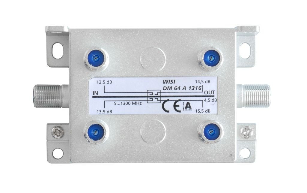 Der DM64A 1316 ist ein asymmetrischer 4-fach Abzweiger mit einer Abzweigdämpfung von 13 dB bis zu 16 dB für die Anwendung in Verteilsystemen mit einer Stammleitung. Mit einem Frequenzbereich bis 1,3 GHz ist der Abzweiger bestens für DOCSIS 3.1 Anwendungen geeignet. Das weißbronze-beschichtete Gehäuse ermöglicht sehr hohe Schirmungseigenschaften der Klasse A (+10 dB) und gewährleistet eine störungsfreie Übertragung der Signale im Empfangs und Verteilsystem. Aufgrund der stetig steigenden multimedialen Inhalte ist eine hohe Intermodulationsfestigkeit sehr wichtig, der Abzweiger DM64A 1316 erfüllt hierfür die Anforderungen gemäß EN 60728-4.