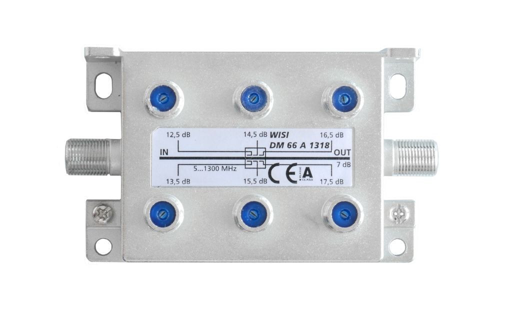 Der DM66A 1318 ist ein asymmetrischer 6-fach Abzweiger mit einer Abzweigdämpfung von 13 dB bis zu 18 dB für die Anwendung in Verteilsystemen mit einer Stammleitung. Mit einem Frequenzbereich bis 1,3 GHz ist der Abzweiger bestens für DOCSIS 3.1 Anwendungen geeignet. Das weißbronze-beschichtete Gehäuse ermöglicht sehr hohe Schirmungseigenschaften der Klasse A (+10 dB) und gewährleistet eine störungsfreie Übertragung der Signale im Empfangs und Verteilsystem. Aufgrund der stetig steigenden multimedialen Inhalte ist eine hohe Intermodulationsfestigkeit sehr wichtig, der Abzweiger DM66A 1318 erfüllt hierfür die Anforderungen gemäß EN 60728-4.
