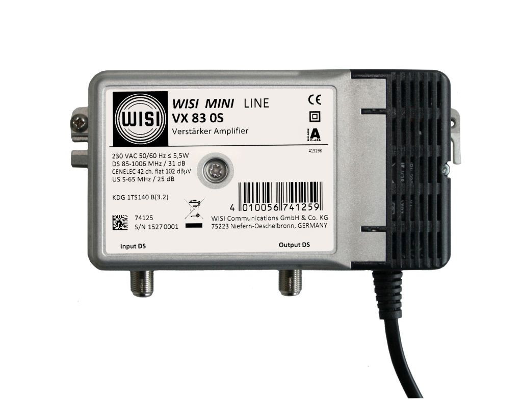 VX 83 0S ist ein ortsgespeister 1 GHz Hausanschlussverstärker im Mini Line-Gehäuse mit Klappdeckel. Freigegeben von Vodafone Kabel Deutschland nach KDG 1TS140 (Klasse B 3.2). Die Verstärkung im Vorwärtsweg beträgt 31 dB und im Rückweg 25 dB. Alle Einstellelemente sind als variable Dämpfungssteller (Drehsteller) ausgeführt. Rückwegverstärker und Pegelsteller sind bereits im Verstärker integriert, somit ist für den Betrieb kein weiteres Zubehör notwendig.
