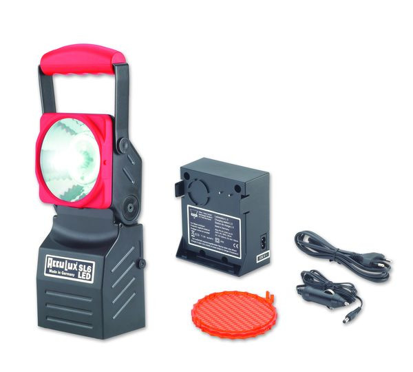 AccuLux SL 6 LED Set (Art.Nr. 456541, schwarz/rot) Superlicht durch ausfallsichere 3 W PowerLED + Linsenfokus als Hauptlicht; kein Lampenwechsel mehr; Handscheinwerfer mit separatem Ladeteil: in Gebäuden oder Fahrzeugen montierbar; sehr praktisch: durch die schnelle Ein- und Ausrastfunktion des Ladeteils kann die Leuchte schnell abgenommen werden; Notlichtfunktion; Schutzart IP 54 (Leuchte); Blinklichtfunktion; sehr leicht: nur ca. 1100g; Leuchtenkopf 110° schwenkbar; Akku-Kapazitätsanzeige; Set inkl. Ladestation, Netzkabel 230 V, Kfz-Ladekabel 12/24V, Vorsatzscheibe orange