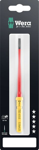 VDE Klinge für Kraftform Kompakt Griff-/Wechselklingensystem. Blitzschneller Austausch der Klinge ohne Sonderwerkzeug. Stückgeprüfte Werkzeuge gem. IEC 60900. Stückprüfung bei 10.000 V für sicheres Arbeiten bei der zugelassenen Spannung von 1.000 V. Reduzierter Klingendurchmesser mit integrierter Schutzisolation, so können tiefliegende Schraub- und Federelemente erreicht und betätigt werden. Die Wera Black Point-Spitze bietet Passgenauigkeit und optimierten Korrosionsschutz. Mit Werkzeugfinder Take it easy: Farbkennzeichnung nach Profilen sowie aufgelaserter Größenangabe. Der Sechskantabrollschutz verhindert das unbeabsichtigte Wegrollen der Klinge.