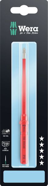 VDE Edelstahl-Wechselklinge für Kraftform Kompakt Griff-/Wechselklingensystem. Blitzschneller Austausch der Klinge ohne Sonderwerkzeug. Stückgeprüfte Werkzeuge gem. IEC 60900. Stückprüfung bei 10.000 V für sicheres Arbeiten bei der zugelassenen Spannung von 1.000 V. Reduzierter Klingendurchmesser mit integrierter Schutzisolation, so können tiefliegende Schraub- und Federelemente erreicht und betätigt werden. Die Edelstahlwerkzeuge von Wera sind vakuumeisgehärtet und verfügen damit über die für Verschraubungen benötigten Härten und Festigkeitswerte. Der industrielle Einsatz ist ohne Einschränkungen möglich. Mit Werkzeugfinder Take it easy: Farbkennzeichnung nach Profilen sowie aufgelaserter Größenangabe. Der Sechskantabrollschutz verhindert das unbeabsichtigte Wegrollen der Klinge.