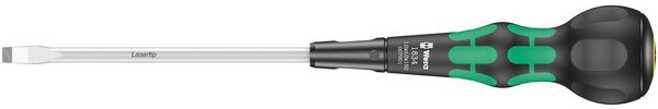 Schraubendreher mit Kraftform Serie 1800 Griff für Schlitzschrauben. Der Griff liegt hervorragend in der Hand. Die ballige Form ermöglicht die Übertragung hoher Drehmomente. Die weichen Griffzonen sorgen für eine griffige Haptik und verlustarme Kraftübertragung. Die harten Griffzonen erlauben eine hohe Kraftübertragung, auch wenn mit dem Handballen Druck ausgeübt wird. Die Finger-Griffmulden am oberen Ende des Griffs erleichtern feine Justier-Arbeiten beim Verschrauben. Durch den schmalen Übergang zwischen Griff und Klinge können auch schwer erreichbare und tiefliegende Schrauben in engen Bereichen gut erreicht werden. Der Abrollschutz am hinteren Griffende erschwert lästiges Wegrollen des Werkzeugs am Arbeitsplatz. Die Spitze von Wera Lasertip-Schraubendrehern wird mit Laserstrahlen mikroskopisch fein aufgeraut. Diese raue Oberfläche "beißt" sich förmlich im Schraubenkopf fest. Das unbeabsichtigte Herausrutschen aus der Schraube wird so verhindert.