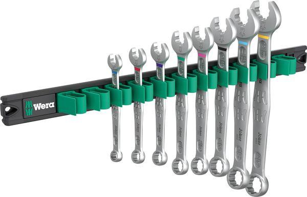 Ringmaulschlüssel-Set, 8-teilig, zöllige Größen; auf Klemmleiste. Der Joker 6003 erzielt durch die Kombination des um 7,5° geschwenkten Mauls und der Doppelsechskantgeometrie eine Verdopplung der Ansetzpunkte. Bei einer wiederholten 180°-Drehung des Schlüssels um die Längsachse während des Schraubens gibt es vier Ansetzmöglichkeiten und Muttern bzw. Schraubenköpfe können alle 15° "gepackt" werden. Dadurch wird das Verschrauben besonders in engen Bauräumen deutlich einfacher. Die schlanke und dennoch robuste Ringseite ist um 15° zur Werkzeugachse abgewinkelt. Durch die hochwertige Oberflächenvergütung wird ein hoher und lang anhaltender Korrosionsschutz erzielt. Mit Werkzeugfinder Take it easy: Farbkennzeichnung nach Größen. Die Klemmen der Leiste sorgen für perfekten Halt der Werkzeuge. Die Leiste hält durch starken Magnet sicher an Metallflächen. Alternativ kann die Leiste auch an eine Wand geschraubt werden.