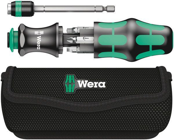 Die Wera Kompaktwerkzeuge ermöglichen den gleichzeitigen Einsatz der beiden Verschraubungsarten "Hand" oder "Maschine". Das Griff -Wechselklingensystem in kompakter Bauweise mit verschiedenen Klingenspitzen auf kleinstem Raum macht den Anwender mobil und flexibel. Geeignet für Bits mit 1/4"-Außensechskantantrieb nach DIN ISO 1173-C 6,3 und E 6,3 (ISO 1173) und Wera Anschluss-Reihen 1 und 4. Mit Verbindungsteil, Bajonett, Rapidaptor-Technologie. Kraftform-Griff mit Abrollschutz, mehrkomponentig für besonders ergonomisches Verschrauben. Integriertes Magazin zur Aufbewahrung der Bits. Die im Griff versenkbare Bajonettklinge mit Schnellwechselfutter erlaubt die schnelle Handbetätigung auch in räumlich beengten Arbeitssituationen, wenn die Klinge eingefahren ist. Durch einfaches Betätigen der Arretierhülse kann die Klinge herausgefahren werden. Der Bajonetthalter ist nun wie ein vollwertiger Schraubendreher einsetzbar. Die Bajonettklinge kann entnommen und als Maschinenadapter eingesetzt, sowie in die Ausgangslage zurückgeführt werden. Mit praktischer Gürteltasche.