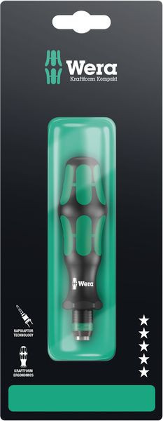 Hochwertiger Bit-Handhalter. Das Schnellwechselfutter Rapidaptor ermöglicht blitzschnellen Bitwechsel ohne Hilfswerkzeug. Der starke Dauermagnet hält die Bits bombenfest. Kraftform Plus Griff für angenehm ergonomisches Arbeiten, bei dem Blasen und Schwielen vermieden werden. Harte Griffzonen für hohe Arbeitsgeschwindigkeit, während weiche Griffzonen hohe Drehmomentübertragung garantieren. Geeignet für Bits mit 1/4"-Außensechskantantrieb nach DIN ISO 1173-C 6,3 und E 6,3 (ISO 1173).