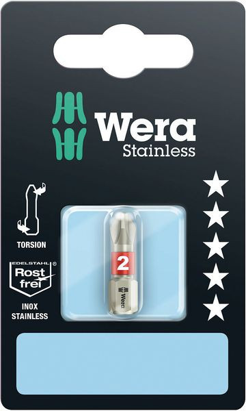 Hochwertige Bits aus Edelstahl für Kreuzschlitzschrauben. Wera Edelstahl Werkzeuge werden aus Edelstahl gefertigt, wodurch der unansehnliche Fremdrost vermieden wird. Mit Torsionszone: Bei Torsion-Bits werden Drehmomentspitzen in der Torsionszone abgefedert. Vorzeitiger Verschleiß wird vermieden, die Lebensdauer des Bits erhöht. 1/4"-Sechskant, passend für Halter nach DIN ISO 1173-D 6,3.