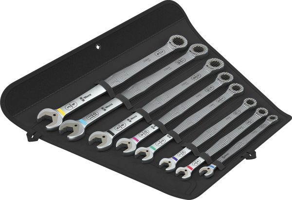 8-teiliges Maul-Ringratschenschlüssel-Set. Zöllige Größen.Geniale Kombination aus Maulende und Ratschenmechanik am Ringende in langer Ausführung. Für Sechskant-Schraubenköpfe bzw. -Muttern. Der lange Hebel ermöglicht höhere Kraftübertragung. Die lange Ausführung dient auch der besseren Zugänglichkeit bei tiefliegenden Verschraubungen. Mit Haltefunktion durch Metallplatte im Maul, die die Gefahr des Verlierens von Schrauben und Muttern reduziert. Die auswechselbare Metallplatte im Maul sichert mit extra harten Zähnen Schrauben und Muttern und reduziert die Abrutschgefahr. Der integrierte Endanschlag kann das Abrutschen vom Schraubenkopf nach unten verhindern und ermöglicht das Aufbringen hoher Drehmomente. Die Doppelsechskantgeometrie sorgt für die formschlüssige Verbindung mit Schraube oder Mutter und damit für die Verringerung der Abrutschgefahr. Ein Rückschwenkwinkel von nur 30° auf der Maulseite vermeidet zeitintensives Wenden des Schlüssels beim Schrauben. Ratschenmechanik auf der Ringseite mit außergewöhnlich hoher Feinverzahnung von 80 Zähnen für Flexibilität auch in engen Bauräumen. Die spezielle Schmiedegeometrie sorgt für hohe Drehmomentübertragung und hohe Biegungssteifigkeit. Gefertigt aus leistungsfähigem Chrom-Molybdän-Stahl mit Nickel-Chrom Beschichtung für hohen Korrosionsschutz. Mit Werkzeugfinder Take it easy: Farbkennzeichnung nach Größen sowie zusätzlich aufgelaserte Größenangabe. In robuster Rolltasche für einfachen Transport und saubere Aufbewahrung. 2 Schlaufen zum Aufhängen der Rolltasche im geschlossenen und im geöffneten Zustand.