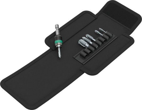 7-teiliger Gewindebohrer-Bit-Satz in robuster Falttasche 9499. Zum Schneiden von metrischen Gewinden. Der Sechskant-Schaft der Bits gewährleistet eine sehr gute Kraftübertragung. Die fein abgestimmte Material-Elastizität sorgt für hohe Standzeiten. Einwandfreie Spanabfuhr und geringe Verkantungsgefahr. Der Rapidaptor gewährleistet blitzschnellen Bitwechsel ohne Hilfswerkzeug. 1/4"-Sechskant, passend für Halter nach DIN ISO 1173-D 6,3.