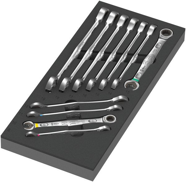 Langlebige Schaumstoffeinlage; 2-farbig zur schnellen Erkennung von fehlenden Teilen; geeignet für den Tool Rebel Werkstattwagen; bestückt mit 11 Maul-Ringratschenschlüsseln Wera 6000 Joker.