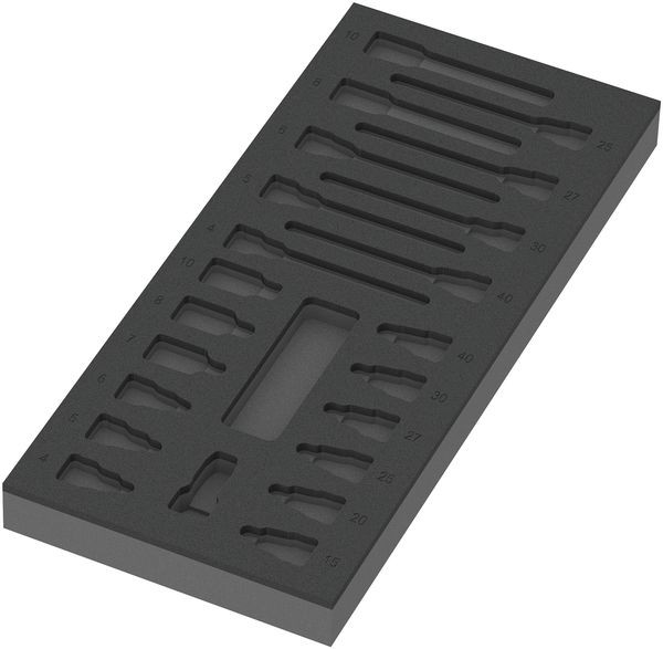 1 langlebige Schaumstoffeinlage, ohne Werkzeug; 2-farbig zur schnellen Erkennung von fehlenden Teilen; Breite x Höhe x Tiefe: 172 x 30 x 392 mm; Ersatzschaumstoffeinlage für Wera Artikel 9723; geeignet für den Tool Rebel Werkstattwagen.