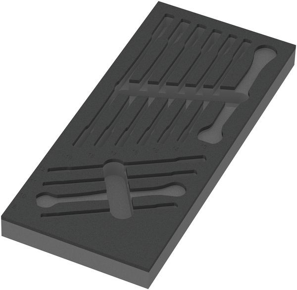 1 langlebige Schaumstoffeinlage, ohne Werkzeug; 2-farbig zur schnellen Erkennung von fehlenden Teilen; Breite x Höhe x Tiefe: 172 x 30 x 392 mm; Ersatzschaumstoffeinlage für Wera Artikel 9730; geeignet für den Tool Rebel Werkstattwagen.