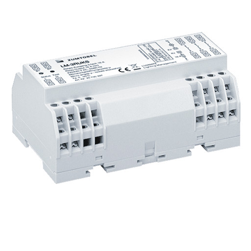 Relais-Ausgangsgerät mit 3 Relaiskontakten zum Schalten von Lampen für Netzspannungen bis 230/240V. Belastung je Kontakt bis zu 16A (bei cosphi=1) möglich. Ausgangsseitig: drei voneinander unabhängig adressierbare / ansteuerbare Ausgänge mit je einer Zwei-Draht-Steuerleitung. Netz- und Busanschluss. Anschlüsse erfolgen über Schraubklemmen, Test-Taster, Status-LED, Schaltschrankgehäuse aus flammwidrigen Polycarbonat, halogenfrei geeignet für Montage auf Hutschiene 35mm Gemäss EN 50022, zulässige Umgebungstemperatur von 0 bis +50°C, Schutzart IP20, Abmessungen: 140 x 90 x 59mm, 8 TE je 17,5mm.
