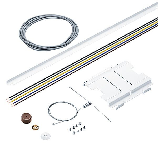 Montageset in bronze zum Umbau einer Einzelleuchte zur Lichtbandleuchte bestehend aus: 1 Stl Leuchtenverbinder mit Querseil, 1 Stk. Abhängeseil in Länge Seillänge 1200 mm, 1 Stk. Deckenbefestigungselement in bronze, 1 Stk. elektrische Drahtbrücke 5 polig.