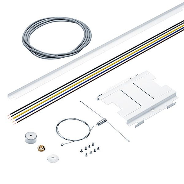 Montageset in silber zum Umbau einer Einzelleuchte zur Lichtbandleuchte bestehend aus: 1 Stl Leuchtenverbinder mit Querseil, 1 Stk. Abhängeseil in Länge Seillänge 1200 mm, 1 Stk. Deckenbefestigungselement in silber, 1 Stk. elektrische Drahtbrücke 5 polig.
