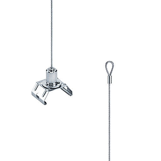 Seilabhängung mit Schlaufe (Durchmesser: 6 mm) für eine werkzeuglose Verbindung der Tragschiene mittels CLIX-Technik. Befestigungsfeder aus nicht rostendem Federstahl V2A. Seil aus verzinktem Stahl. Stufenlose Höhenerstellung. Ablängen des Seiles möglich. Maximale Zugbelastung 30kg. Abmessungen Befestigungsfeder: 28 x 42 x 9 mm. Abmessungen: Durchmesser 2 x 2000 mm. Gewicht: 0,09 kg