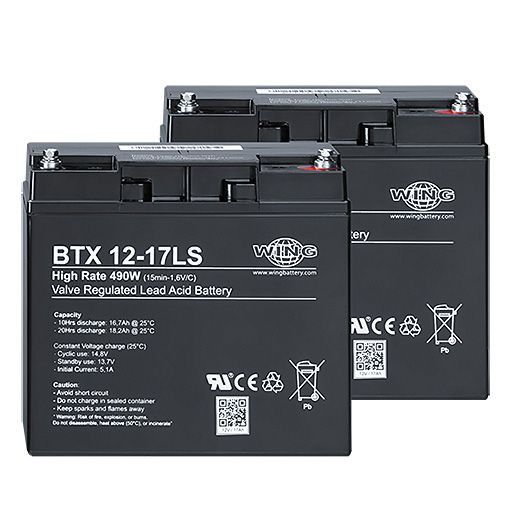 2 Stück Blockbatterien, Verschlossene, wieder-aufladbare extrem gasungsarme High Rate (Blei/Kalzium in Glasfaser-Vliestechnik) OGiV Batterien 12 V / 17 Ah mit einem Design Life von 12 Jahren bei 20°C, entsprechend der EUROBAT-Klasse: High Performance. Abmessungen: 181 x 77 x 167 mm (L/B/H), Gewicht: 5,9 kg pro Stück, Polanschluss: M5 Drehmoment 5-7 Nm mit Faston F2 Adapter Merkmale nBox ACCU SET PB 2 Stück 12V/17Ah - OGiV High Rate Gitterplatten (Blei/Kalzium) - Entsprechen der EUROBAT Klasse high Performance - Brauchbarkeitsdauer 12 Jahre @ 20°C Umgebungstemperatur - Gehäuse und Deckel ABS - Extrem gasungsarm, verschlossene Bauart - Niedrige Selbstentladung - Keine Transportbeschränkungen - 100% recyclebar - Wartungsfrei über die gesamte Brauchbarkeitsdauer - Nominalspannung 2x12 V / 24 V DC - Entsprechen DIN EN 60896 - Lüftung nach EN IEC 62485-2:2018 Zusätzliche Info: Der Batteriesatz darf nicht länger als 2 Monate nach Auslieferung ohne Batterieladung gelagert werden. Spätestens nach 2 Monaten muss der Batteriesatz an die Anlage angeschlossen werden. Bei nicht einhalten dieser Anweisungen wird jegliche Haftung respektive Garantieansprüche abgelehnt.