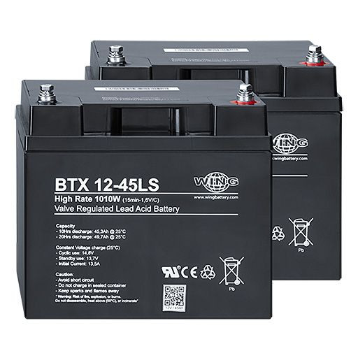 2 Stück Blockbatterien, Verschlossene, wieder-aufladbare extrem gasungsarme High Rate (Blei/Kalzium in Glasfaser-Vliestechnik) OGiV Batterien 12 V / 45 Ah mit einem Design Life von 12 Jahren bei 20°C, entsprechend der EUROBAT-Klasse: High Performance. Abmessungen: 197 x 165 x 170 mm (L/B/H), Gewicht: 13,8 kg pro Stück, Polanschluss: M6 Drehmoment 5-7 Nm mit Faston F2 Adapter Merkmale nBox ACCU SET PB 2 Stück 12V/45Ah - OGiV High Rate Gitterplatten (Blei/Kalzium) - Entsprechen der EUROBAT Klasse high Performance - Brauchbarkeitsdauer 12 Jahre @ 20°C Umgebungstemperatur - Gehäuse und Deckel ABS - Extrem gasungsarm, verschlossene Bauart - Niedrige Selbstentladung - Keine Transportbeschränkungen - 100% recyclebar - Wartungsfrei über die gesamte Brauchbarkeitsdauer - Nominalspannung 2x12 V / 24 V DC - Entsprechen DIN EN 60896 - Lüftung nach EN IEC 62485-2:2018 Zusätzliche Info: Der Batteriesatz darf nicht länger als 2 Monate nach Auslieferung ohne Batterieladung gelagert werden. Spätestens nach 2 Monaten muss der Batteriesatz an die Anlage angeschlossen werden. Bei nicht einhalten dieser Anweisungen wird jegliche Haftung respektive Garantieansprüche abgelehnt.