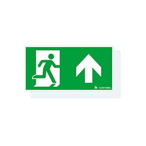 Sicherheitszeichen für CROSSIGN 110 MSC/TEC-GP, Abdeckung mit Sicherheitszeichen aus PC mit Digitaldruck, Sicherheitszeichen gemäß ISO 7010: 1seitig, Symbol: Rettungsweg/Notausgang. Richtungspfeil nach oben, Erkennungsweite gemäß EN 1838: 22 m, Abmessung: 222 x 5 x 110 mm, Gewicht: 0,19 kg.