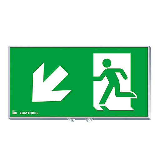 Sicherheitszeichen für PURESIGN 150 MSW/MRW ERI mit Aluminiumrahmen, silber (RAL 7035 ähnlich) pulverbeschichtet, zur werkzeuglosen Montage auf das PURESIGN 150 ERI Gehäuse. ERI Funktion mit 2 zusätzlichen high power LEDs und 360° verstellbaren asymmetrischen Linsen zur Fluchtwegbeleuchtung, rastend in 90° Positionen. Gleichmäßige Hinterleuchtung des Piktogramms durch integrierte low power LEDs mit einer Leuchtdichte > 500 cd/m² im weißen Bereich, Piktogramm per Digitaldruck auf die PC (Polycarbonat)- Scheibe aufgebracht, Sicherheitszeichen gemäß ISO 7010: 1seitig, Symbol: Rettungsweg/Notausgang. Richtungspfeil zur Seite nach unten, Erkennungsweite gemäß EN 1838: 30 m, Abmessung: 310 x 20 x 160 mm, Gewicht: 0,72 kg.