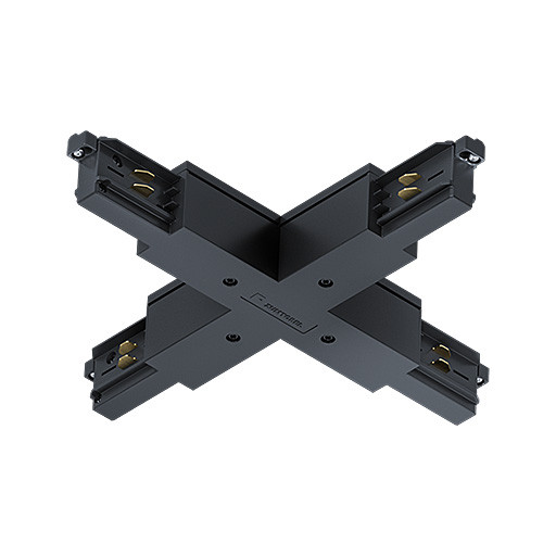 3 Phasen-X-Verbinder TRACK basic Farbe schwarz (ähnlich RAL 9005) zur mechanischen und elektrischen Verbindung von vier Stromschienen, zur Einspeisung von vier Stromschienen, Leitungseinführung von oben, Kunststoffteile aus Polycarbonat (PC) Einbauabmessungen: 148x148x38 mm