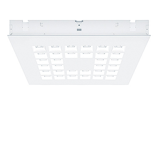 Modulare LED Deckeneinbauleuchte mit Linsenoptik. Leuchten Leistung: 17,5 W, mit LED-Konverter, LED-Lebensdauer 100000 h bis zu einem Lichtstromrückgang auf 80 % des Anfangswertes. Farborttoleranz (initial MacAdam): 2. Leuchten Lichtstrom: 2700 lm, Leuchten Lichtausbeute: 154 lm/W. Farbwiedergabe Ra > 80, Farbtemperatur 3000 K. Symmetrisch breit abstrahlende Leuchte. Lichtlenkung über quadratische Linsenoptik entblendete Lichtverteilung mit UGR < 16 und L65 < 1000 cd/m² gemäß EN 12464:2011, geringe Schmutzempfindlichkeit und einfache Reinigung, flaches Leuchtengehäuse aus Stahlblech lackiert in weiß, Installation als nivellierbare Leuchte für gesägte Deckenöffnungen und Moduldecken mit verdecktem oder sichtbaren Trägersystem, Befestigungsset ist separat zu bestellen, Leuchte halogenfrei verdrahtet, Abmessungen: 623 x 623 x 74 mm, Gewicht: 6,84 kg