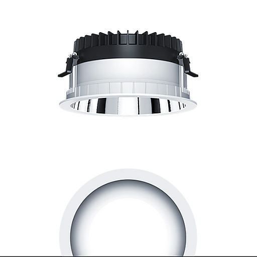 LED Decken-Einbauleuchte (Komplettleuchte) R200, mit symmetrisch, breitstrahlender Lichtverteilung (79 °), höchste Leuchteneffizienz und eine optimale Downlight Lichttechnik, hohe Nachhaltigkeit aufgrund durchgängigen, maximal- modularen Aufbau und austauschbaren Komponenten. Austauschbares LED Modul, symmetrisch, breitstrahlender Lichtverteilung, Farbwiedergabe Ra > 90 (R9>50), Farbtemperatur 4000 K, Farborttoleranz (initial MacAdam): 2, Leuchten Leistung: 14,1 W, Leuchten Lichtstrom: 2030 lm, Leuchten Lichtausbeute: 144 lm/W, Mittlere Bemessungslebensdauer: L80 100000 h bei 25 °C + L90 50000 h bei 25 °C, mit separaten, steckbaren LED-Konverter, DALI steuerbare Leuchte (DALI only) mit DC-Funktion, einstellbar 1-100 %, Notstromlevel auf 15% voreingestellt, NFC konfigurierbar, SwitchDIM-kompatibel, hochwertige Reflektoreinheit über Bajonettverschluss an modularer LED-Lichtkammer arretiert, hocheffiziente LED Lichtkammer integriert im optimierten, passives Wärmemanagement aus hochwertigem wärmeleitendem Polycarbonat, Reflektor/Abdeckring aus hochwertigem, UV-beständigem Polycarbonat (PC), Reflektor: aluminiumbesputtert, hochglänzend, irisierungsfrei, Abdeckring: weiß, Einbauring aus Polycarbonat (PC), weiß, Schutzart: IP54, Leuchte halogenfrei verdrahtet, Anschluss: 5-polige Steckverbindungsklemme, Durchschleifen möglich, Netzspannung: 220-240 V / 0/50/60 Hz, Zentralbatterietauglich 220-240V DC, , Montage: werkzeuglose Schnellmontage mittels Anti-Rutsch-Haltefedern für Deckenstärken von 1-40mm (je nach Leuchtenvariante) aufgrund austauschbarer Haltestege, werkzeuglose Schnellmontage der Leuchteneinheit mittels Bajonettverschluss, Deckenausschnitt: 200mm, Einbautiefe: 120mm, Gewicht: 0,77 kg Für Office Anwendungen gemäß EN12464 (UGR<19 Reflektortyp aluminiumbesputtert)