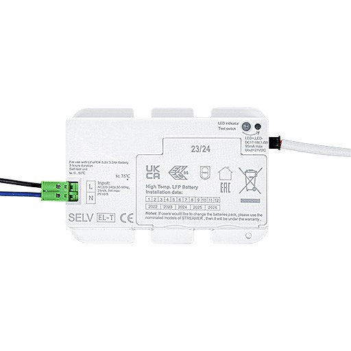 Notlicht-LED-Treiber mit Manuellem Test oder SelfTest (einstellbar mittels Schalter direkt auf dem Produkt), komplett mit LED-Verbindungskabel, LiFePO4 Akku, LED-Anzeige und Testschalter. Erlaubt die rasche, einfache Umstellung von THORNeco Leuchten auf Notbetrieb. Kompatibel mit LARA VF2, TOM VF, TOBY VF. SelfTest (EN62034) ist ideal für die Überwachung größerer Gebäude und mehrerer Standorte. LiFePo4 Akku sorgt für eine optimale Akkulebensdauer. Nenn-Versorgungsspannung: 230V, Netzfrequenz: 50/60Hz, Ausgangsleistung: 2W, Bemessene Notbetriebsdauer: 3 Stunden. Akku: LiFePO4 6,4V 1,6Ah, Erstladedauer: 24 Stunden, Umgebungstemperatur (ta): 0°C bis +40°C, Gewicht: 1 kg.