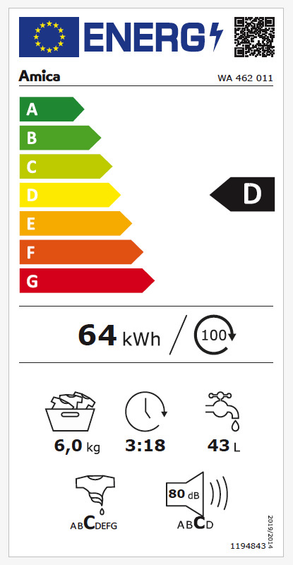 | Energieeffizienzklasse nur Waschzyklus (2019/2014/EU) | D |