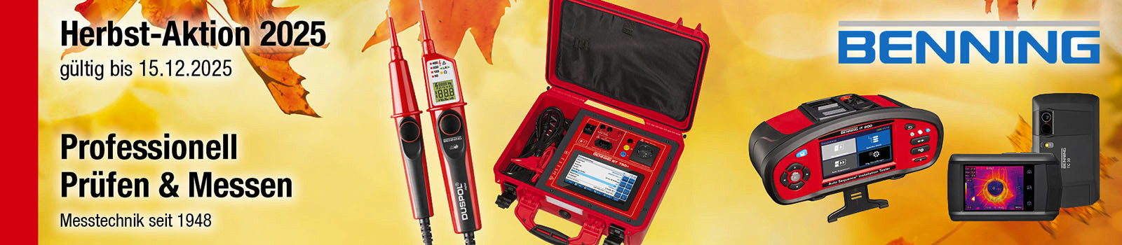 Auch in diesem Herbst bietet BENNING Ihnen wieder exklusive Angebote rund um unsere hochwertigen Prüf- und Messgeräte. Profitieren Sie von attraktiven Sonderpreisen, clever zusammengestellten SETs und entdecken Sie praxisgerechte Lösungen für die unterschiedlichsten Anwendungen – präzise, robust und zuverlässig wie gewohnt. Ob Wartung, Installation oder Inbetriebnahme: Unsere Aktionsprodukte unterstützen Sie effizient im Arbeitsalltag.